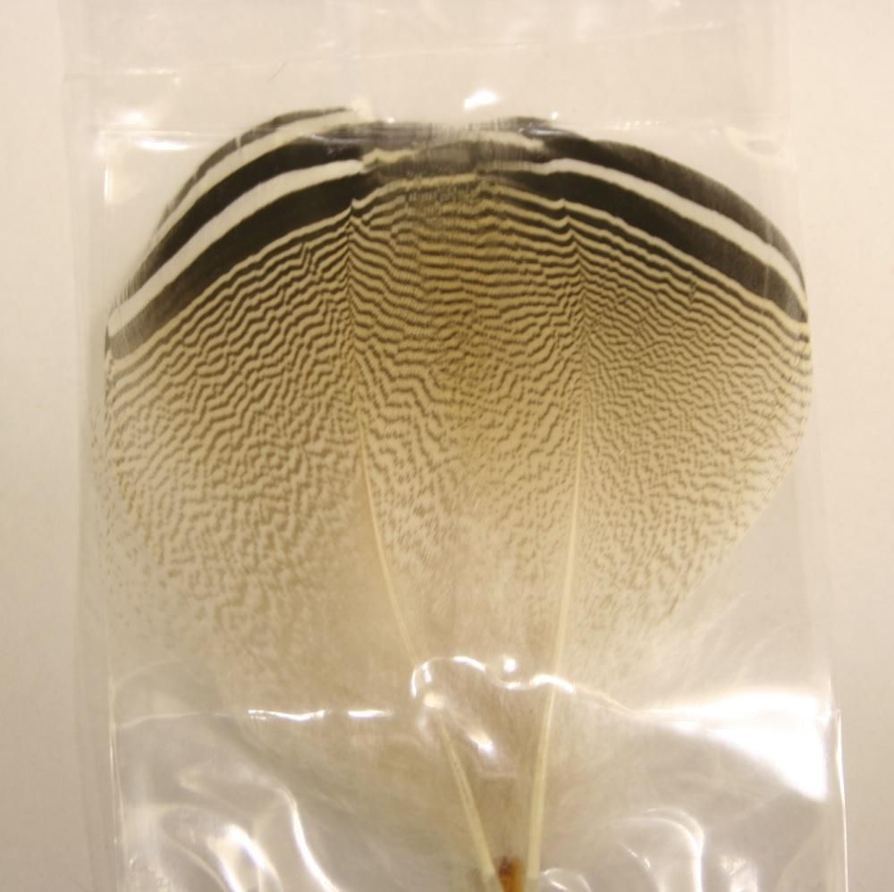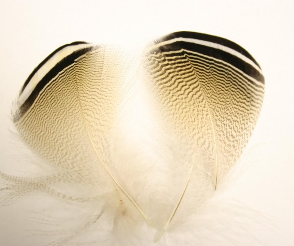 ストライプド・レモンとも呼ばれ、ウッドダックのフランクフェザーのテールよりに 1羽にわずか数枚生えている希少なフェザーで、先端に白と黒の鮮やかなストライプが入っています。
