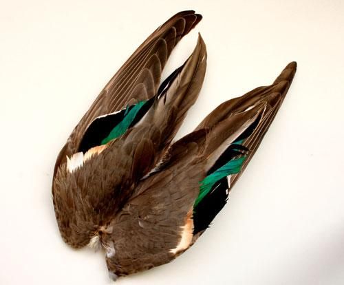 ドライフライ、ウエットフライ、どちらのウイングにも適しています。マラードよりも小型のクイルで、#14以下のウィングに適します。ファイバーの結節力が高く、綺麗なウイングを作り易いのが特徴です。ウィングカバーのグリーンフェザーは、マックスウェルというウェットパターンに使用されています。このコンプリートウイングからは、プライマリー、セカンダリー、美しい色彩のウイングカバーや柔らかい羽根などが取れます。尖った形のプライマリーは表と表を背中合わせにし、クイルの裏側をウイングの表にします。丸い形のセカンダリーは裏と裏を合わせ、クイルの表側がウイングの表になるようにしてウイングを作ります。