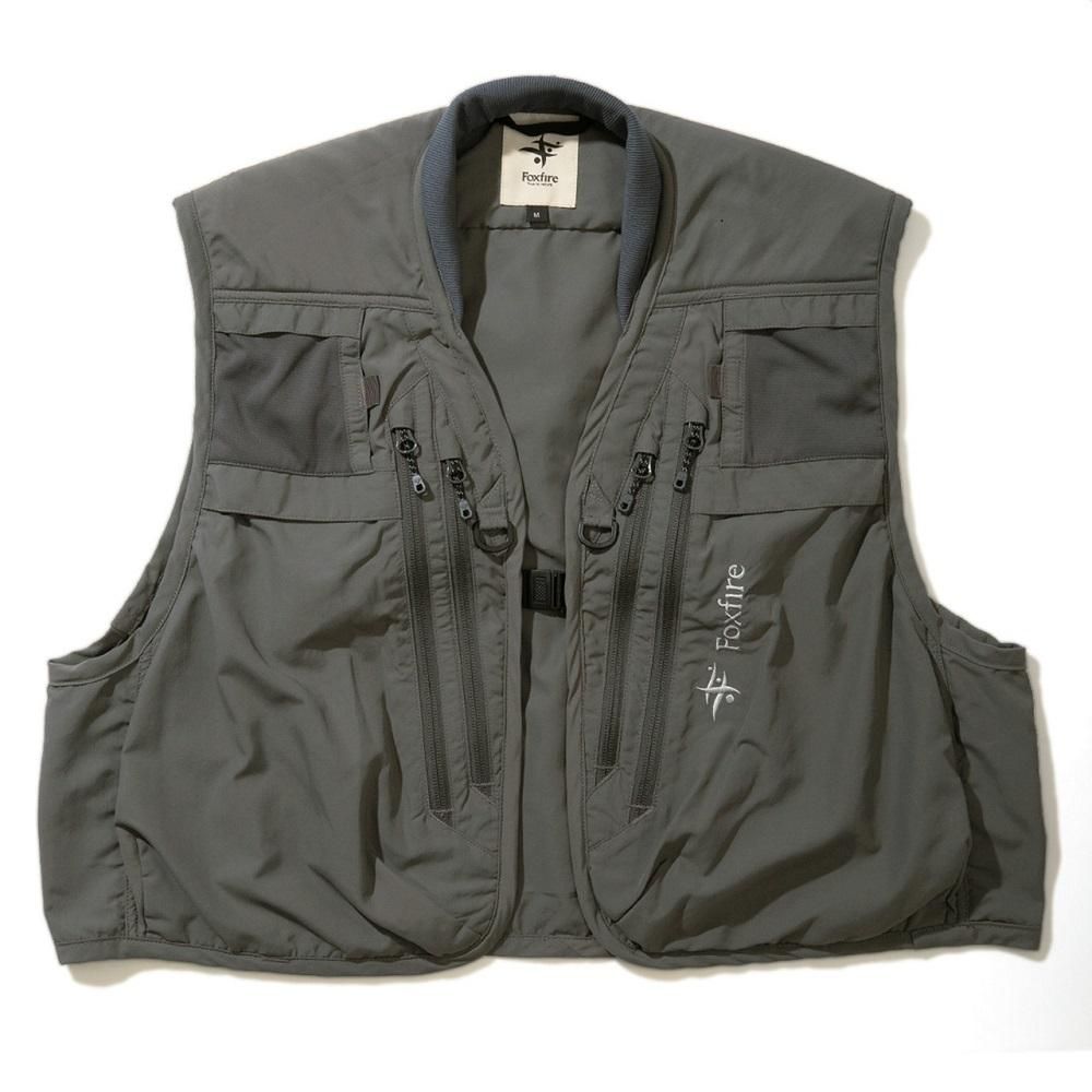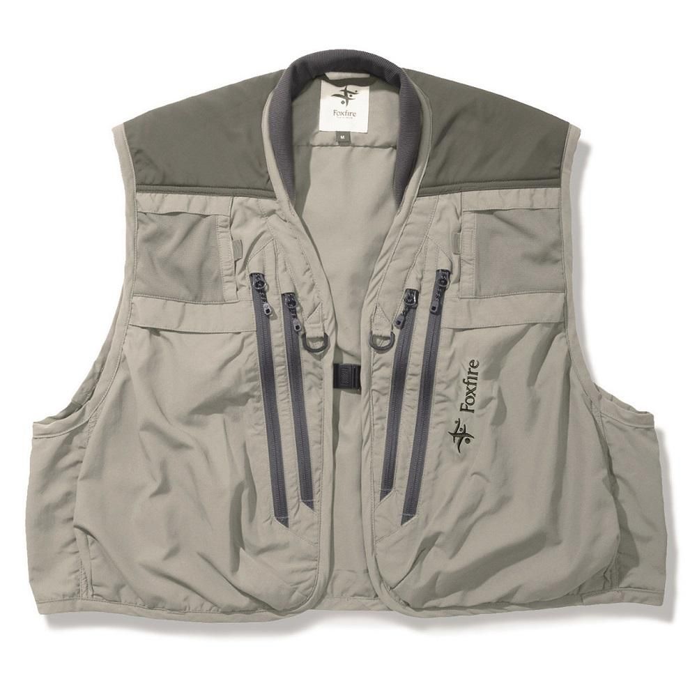 ベストのポケット部ベルクロとレインウェアの袖口部ベルクロは干渉し合わないデザインとなっています。内ポケットには糸クズを入れるダストポケットや偏光サングラスポケット装備し、正面下部にウェーディングスタッフなどを取り付けるD環も付加。背面大型ゲームポケットも装備しています。肩部は複数の素材を組み合わせた過重分散システムを採用。Foxfireのベスト作りのノウハウが凝縮されたクロージングギアです。